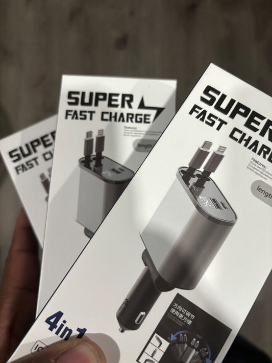 4 in 1 Retractable Car Charger Cable Dual Port USB-C PD Fast Charging Adapter